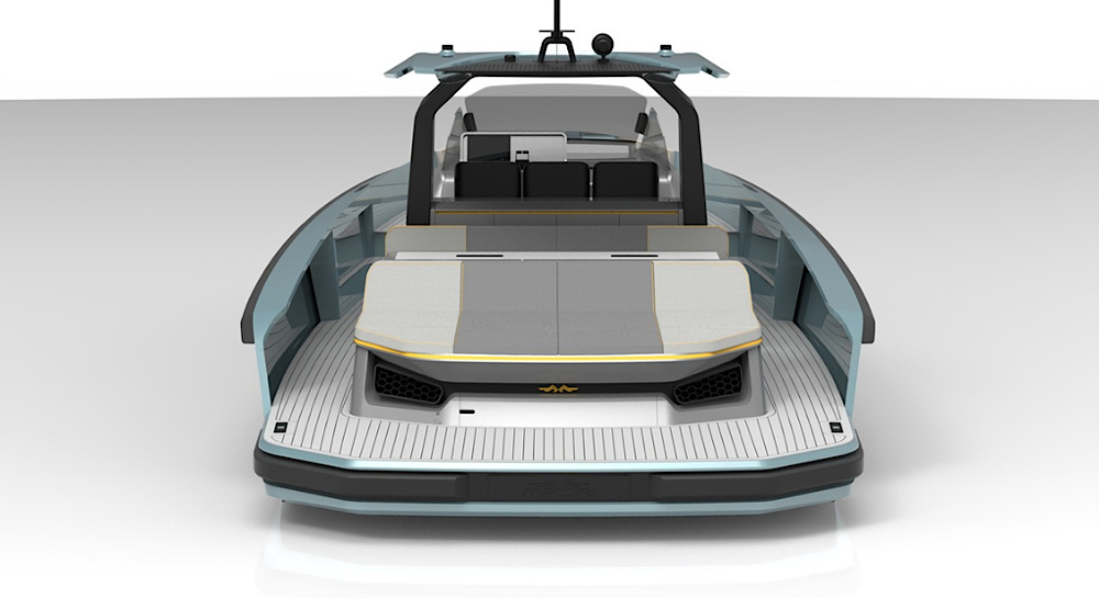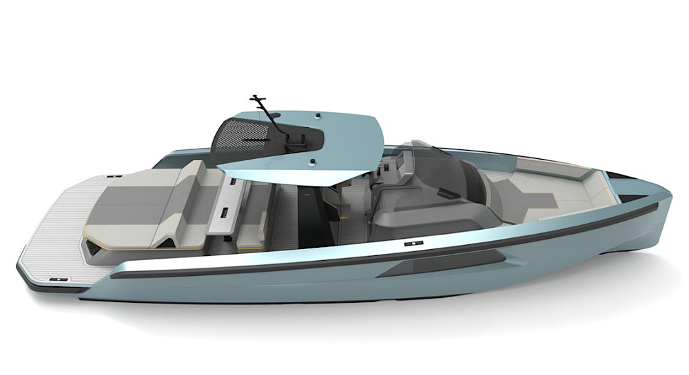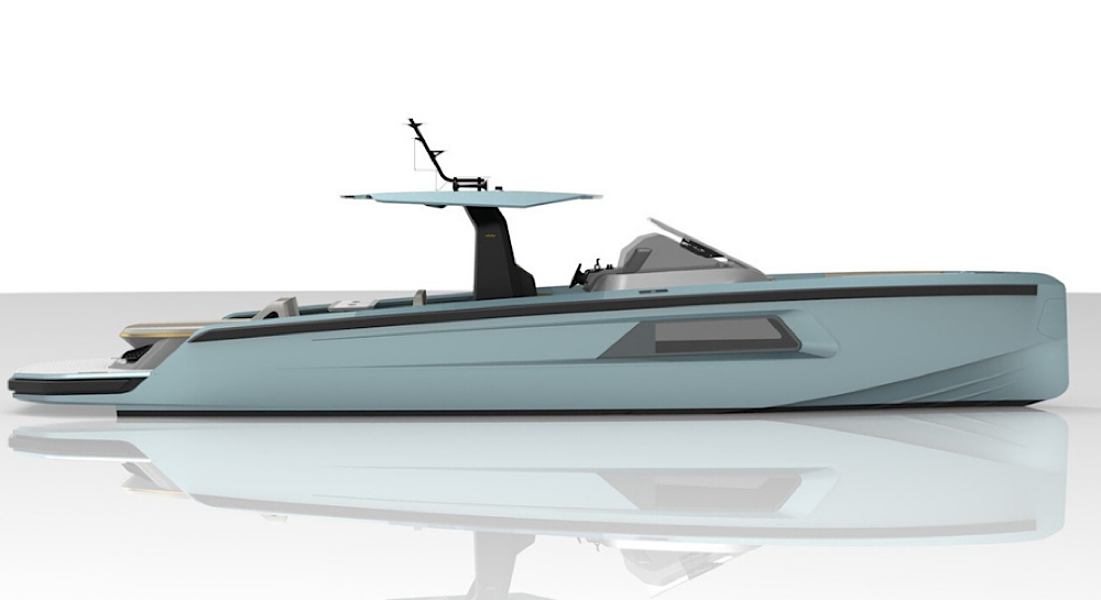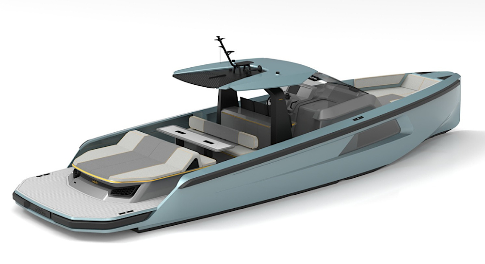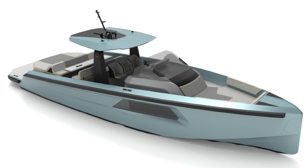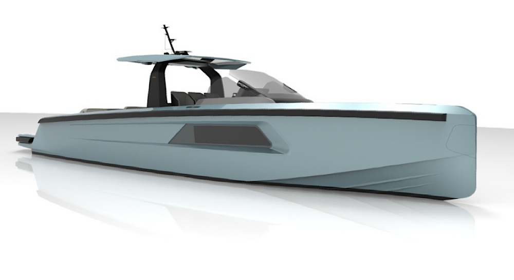 This model is powered by twin Cummings 600hp diesel inboard engines with surface drives and delivers excellent performance characteristics. Finished in Dupont metallic as per renders.