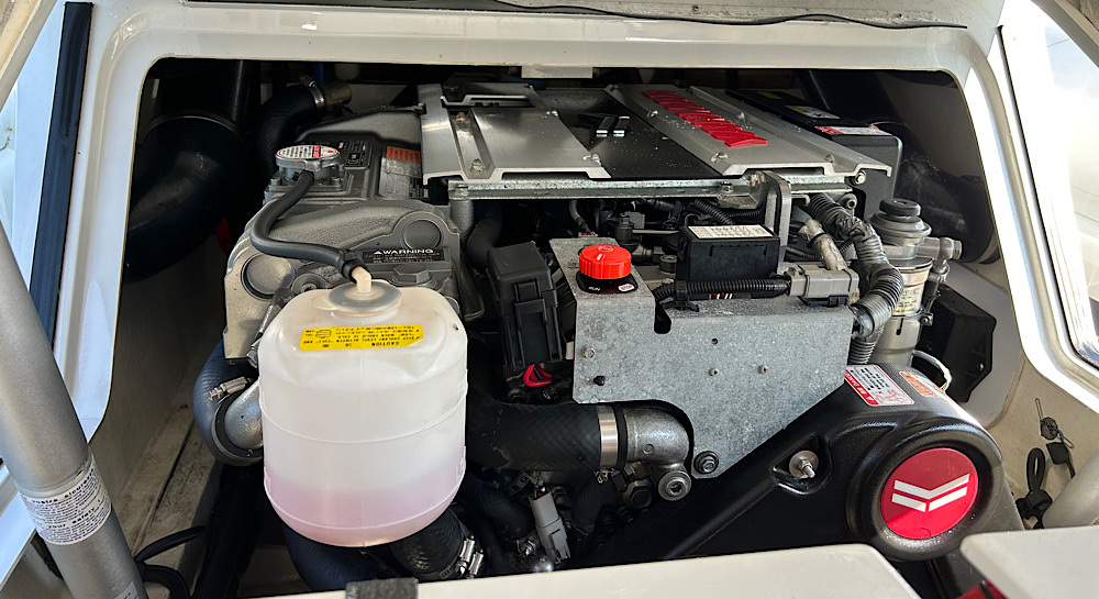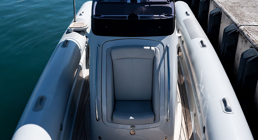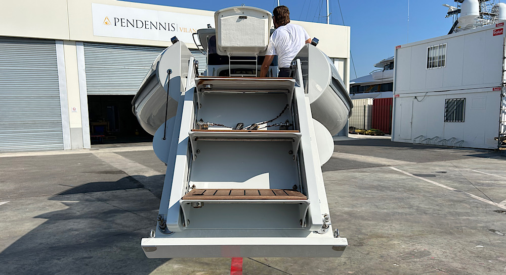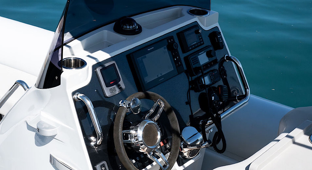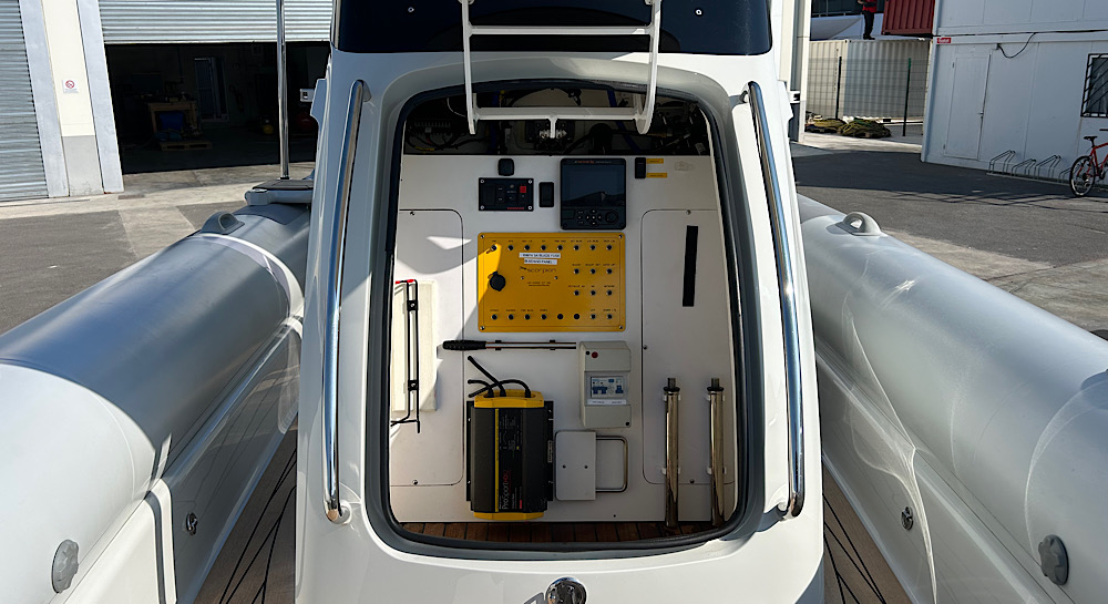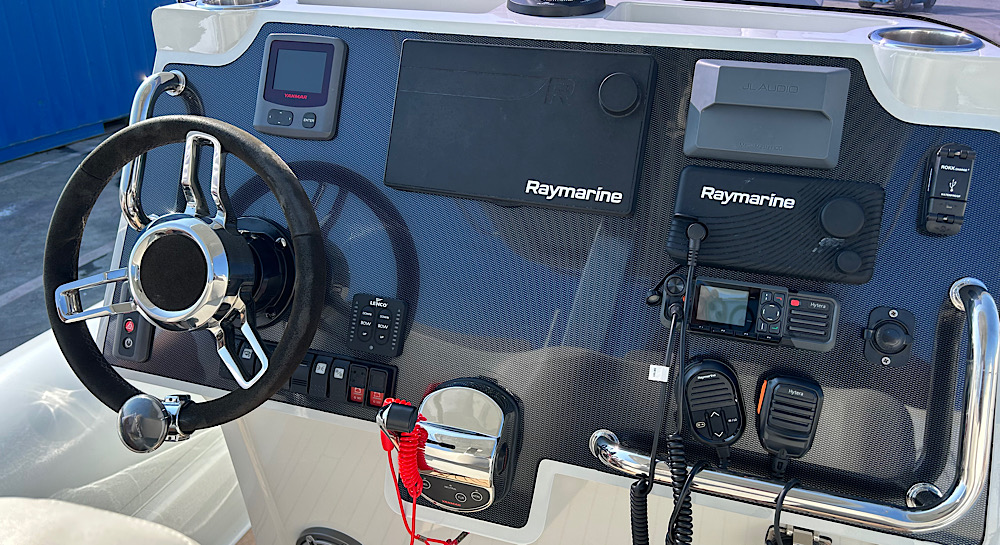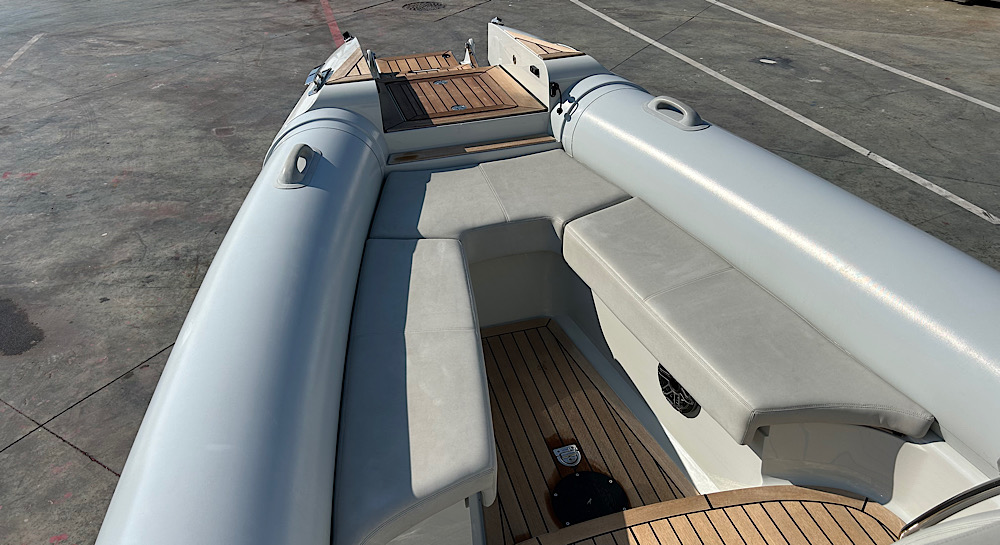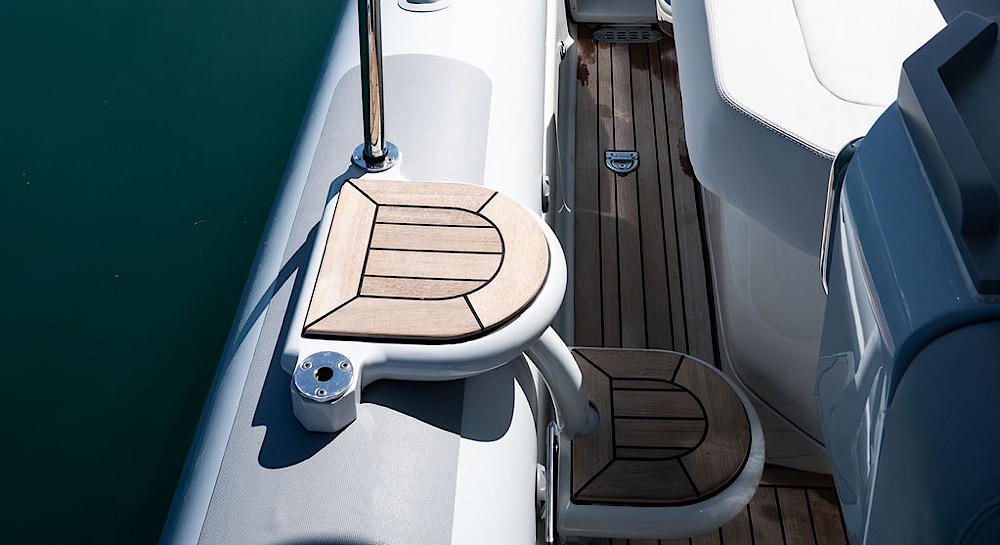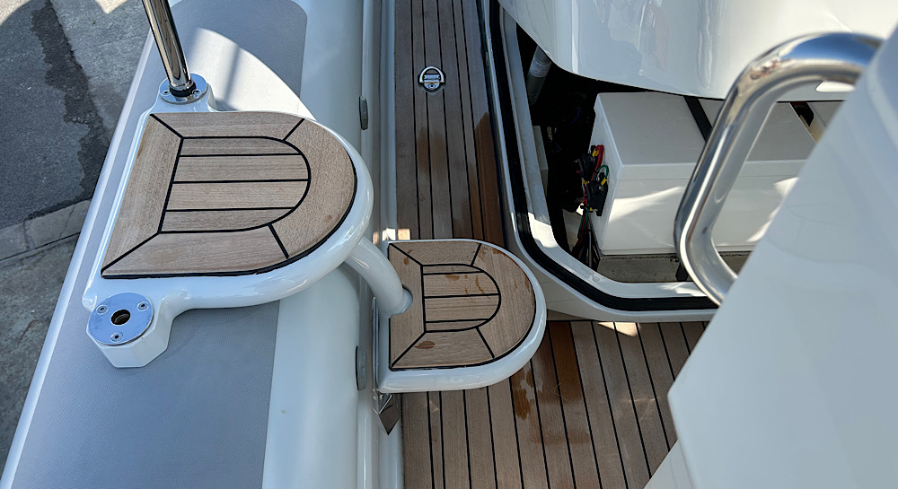 This model has an extensive specification which includes a custom retractable T-Top/Bimini, custom beachlander forward steps, over tube side boarding steps and boarding pole, custom 3 point lifting points, 3 point tow system, upgraded stereo system, custom ski pole / flag pole, teak decks.