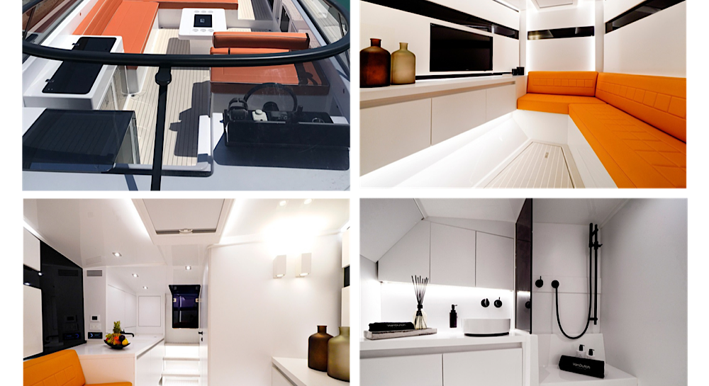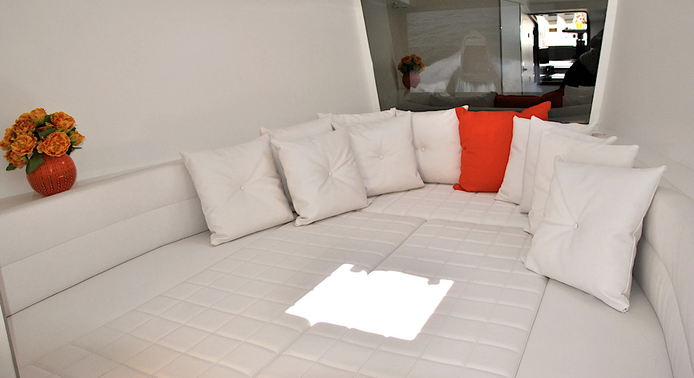WHITE HULL AND DECK; ORANGE HULL DECORATIVE LINES; OFF WHITE SYNTHETIC TEAK FLOOR WITH GREY CAULKING; ORANGE EXTERIOR AND INTERIOR UPHOLSTERY WITH WHITE PIPING